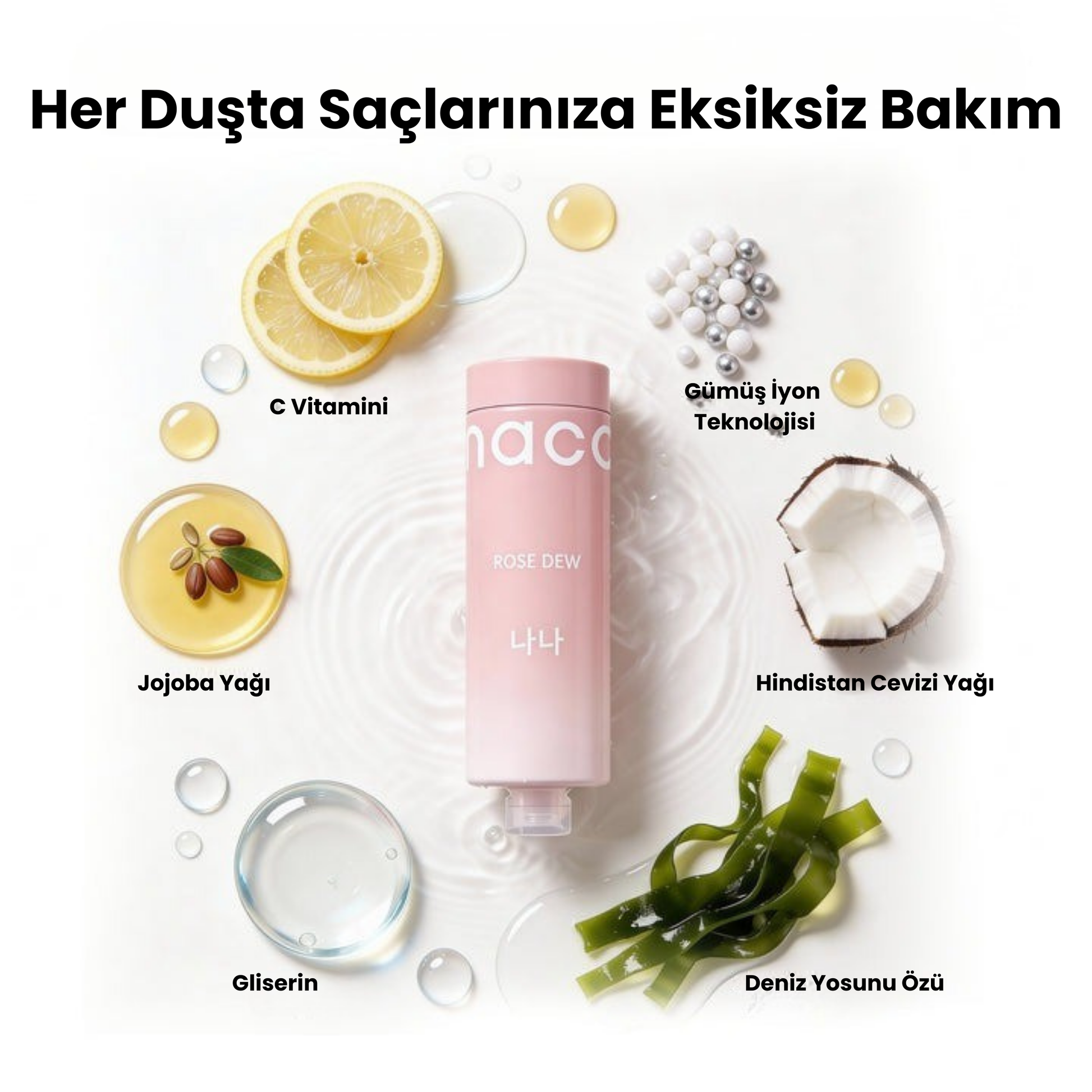 Saç köklerini zayıflatan ve kırılmaya neden olan kloru giderir. C vitamini ve bitkisel özler saç tellerini güçlendirir, elektriklenmeyi azaltır ve saça parlaklık ve kolay şekillendirme sağlar.
